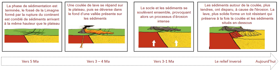 Il y a des millions d’années, une coulée de lave, issue de l’éruption du Puy de la Vigéral sur le Plateau des Dômes, s’est répandue sur 9 km dans le fond d’une vallée. Avec le temps, un phénomène de soulèvement et d’érosion intense a fait disparaître les sédiments moins solides autour de la lave, formant ainsi un plateau basaltique. L’ancienne vallée est devenue une montagne, surplombant le paysage. Le creux est devenu le sommet !